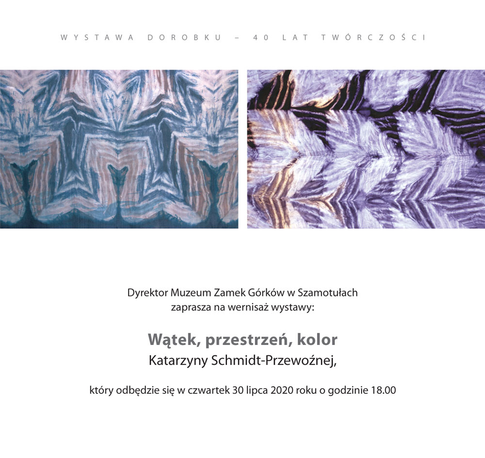 Dyrektor Muzeum Zamek Górków w Szamotułach zaprasza na wernisaż wystawy “Wątek, przestrzeń, kolor” Katarzyny Schmidt-Przewoźnej, który odbędzie się w czwartek 30 lipca 2020 roku o godzinie 18.00