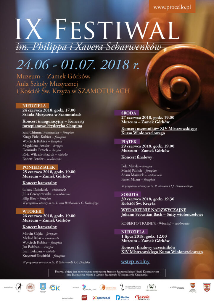 Zapraszamy na IX Międzynarodowy Festiwal Muzyczny im. Philippa i Xavera Scharwenków, który tradycyjnie odbędzie się w Muzeum - Zamek Górków w Szamotułach w dnia 24 VI – 1 VII 2018 r.